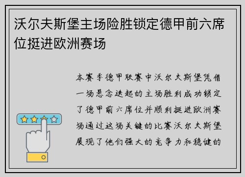 • 沃尔夫斯堡主场险胜锁定德甲前六席位挺进欧洲赛场