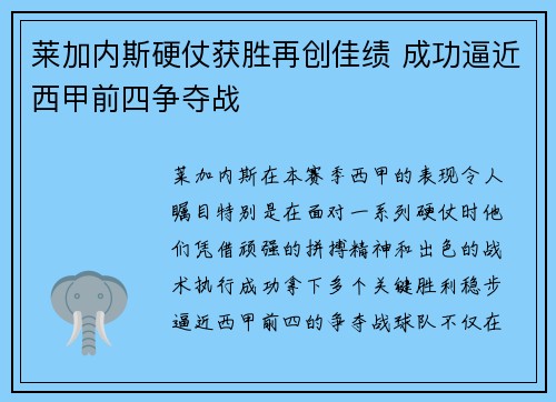 • 莱加内斯硬仗获胜再创佳绩 成功逼近西甲前四争夺战
