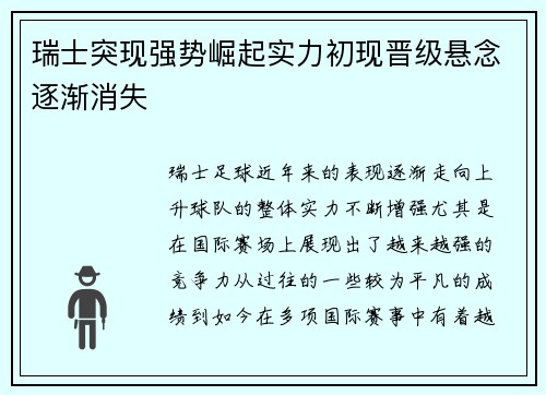 瑞士足球近年来的表现逐渐走向上升,球队的整体实力不断增强,尤其是在国际赛场上展现出了越来越强的竞争力。从过往的一些较为平凡的成绩,到如今在多项国际赛事中有着越来越强的表现,瑞士的崛起无疑是备受关注的话...